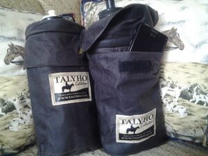 The large insulated double skinned oilskin bag has an easy operated clip that can hook onto the bottom of the bag through a D ring for ease of hand carrying or attach onto something else. The most popular water bottle bag with an iPhone or Android water resistant pocket. iPhone or Android slips in easily into the lined outer pocket with a Velcro securing flap. Within easy reach and safe, if flap is resealed after use.