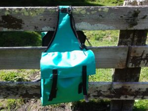 Large Saddle Bag, designed to go behind saddle. Features 2 inside pockets, 1 for sunglasses or similar, other for string or other such items kept separate. Three “D” to tie onto saddle or can come with dog clips. Water proof light canvas, straps are thread through buckle, with Velcro securing. Bag measures 3″ (8cm) deep x 11″ (28cm) long x 11″ (28cm), good size capacity.
